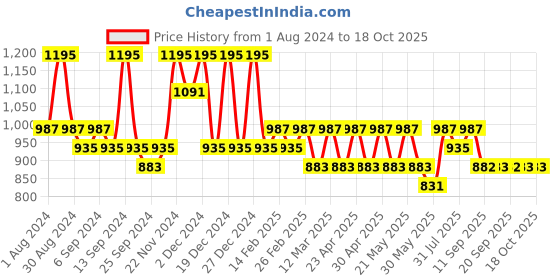 The current price is ₹883, which is ₹52 (6.3%) higher than the best price of ₹831 last seen on 30 May 2025. Over the 443 day price history period, prices have ranged from ₹831 to ₹1,195, with an average of ₹976. The pricing shows moderate volatility, and the overall trend is favorable for consumers as prices are getting cheaper. In terms of recent activity, there have been 0 price changes this week, 1 this month, and 28 over the past year. If you need this product now, it's a reasonable time to buy as prices are stable, but you might want to monitor for potential better deals.