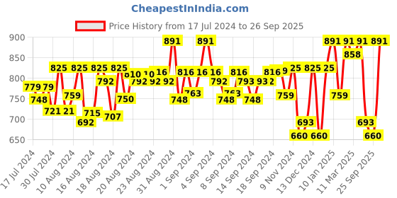 The current price is ₹891, which is ₹231 (35.0%) higher than the best price of ₹660 last seen on 5 Dec 2024. Over the 436 day price history period, prices have ranged from ₹660 to ₹891, with an average of ₹786. The pricing shows moderate volatility, but the overall trend is concerning as prices are getting more expensive. In terms of recent activity, there have been 0 price changes this week, 2 this month, and 13 over the past year. Consider waiting before making a purchase as prices are rising and better deals may be available later.