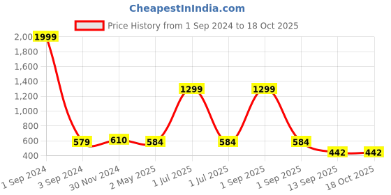 Exciting update! The current price of ₹442 is at its best ever level. Over the 412 day price history period, prices have ranged from ₹442 to ₹1,999, with an average of ₹842. The pricing shows high volatility with significant fluctuations, and the overall trend is favorable for consumers as prices are getting cheaper. In terms of recent activity, there have been 0 price changes this week, 0 this month, and 6 over the past year. This is an excellent time to make a purchase as prices are trending downward and conditions appear favorable.