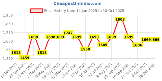 The current price is ₹1,669, which is ₹209.99 (14.4%) higher than the best price of ₹1,459.01 last seen on 21 Jan 2025. Over the 277 day price history period, prices have ranged from ₹1,459.01 to ₹1,903, with an average of ₹1,656. The pricing shows moderate volatility, but the overall trend is concerning as prices are getting more expensive. In terms of recent activity, there have been 0 price changes this week, 1 this month, and 15 over the past year. If you need this product now, it's a reasonable time to buy as prices are stable, but you might want to monitor for potential better deals.