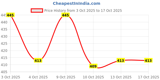 The current price is ₹413, which is ₹4 (1.0%) higher than the best price of ₹409 last seen on 10 Oct 2025. Over the 13 day price history period, prices have ranged from ₹409 to ₹445, with an average of ₹423. The pricing has been quite stable with low volatility, and the overall trend is favorable for consumers as prices are getting cheaper. In terms of recent activity, there has been 1 price change this week, 4 this month, and 4 over the past year. If you need this product now, it's a reasonable time to buy as prices are stable, but you might want to monitor for potential better deals.