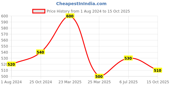 The current price is ₹510, which is ₹10 (2.0%) higher than the best price of ₹500 last seen on 25 Mar 2025. Over the 440 day price history period, prices have ranged from ₹500 to ₹600, with an average of ₹533. The pricing shows moderate volatility, with prices remaining relatively stable overall. In terms of recent activity, there have been 0 price changes this week, 0 this month, and 4 over the past year. If you need this product now, it's a reasonable time to buy as prices are stable, but you might want to monitor for potential better deals.