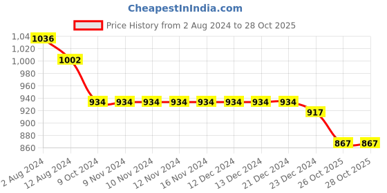 Awesome! The current price of ₹867 is at its best ever level. Over the 451 day price history period, prices have ranged from ₹867 to ₹1,036.39, with an average of ₹936. The pricing has been quite stable with low volatility, and the overall trend is favorable for consumers as prices are getting cheaper. In terms of recent activity, there have been 0 price changes this week, 0 this month, and 8 over the past year. If you need this product now, it's a reasonable time to buy as prices are stable, but you might want to monitor for potential better deals.