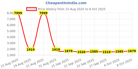 The current price is ₹1,679, which is ₹160 (10.5%) higher than the best price of ₹1,519 last seen on 27 Sep 2025. Over the 54 day price history period, prices have ranged from ₹1,519 to ₹7,999, with an average of ₹2,940. The pricing shows high volatility with significant fluctuations, and the overall trend is favorable for consumers as prices are getting cheaper. In terms of recent activity, there have been 0 price changes this week, 2 this month, and 9 over the past year. The price direction is uncertain, so monitor the situation for a few more days before making a decision.