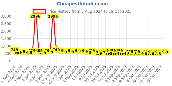 The current price is ₹599, which is ₹121 (25.3%) higher than the best price of ₹478 last seen on 22 Sep 2025. Over the 439 day price history period, prices have ranged from ₹478 to ₹2,996, with an average of ₹711. The pricing shows high volatility with significant fluctuations, and the overall trend is favorable for consumers as prices are getting cheaper. In terms of recent activity, there has been 1 price change this week, 10 this month, and 38 over the past year. The price direction is uncertain, so monitor the situation for a few more days before making a decision.