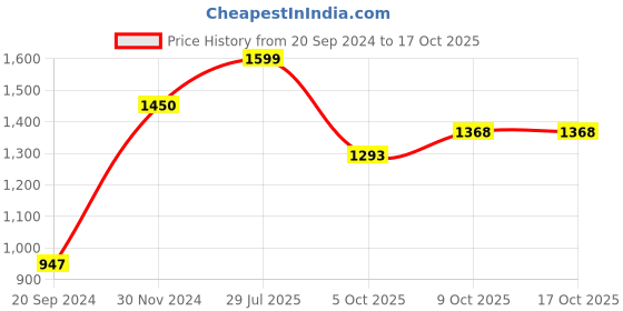 The current price is ₹1,368, which is ₹421 (44.5%) higher than the best price of ₹947 last seen on 20 Sep 2024. Over the 391 day price history period, prices have ranged from ₹947 to ₹1,599, with an average of ₹1,338. The pricing shows moderate volatility, but the overall trend is concerning as prices are getting more expensive. In terms of recent activity, there have been 0 price changes this week, 1 this month, and 3 over the past year. If you need this product now, it's a reasonable time to buy as prices are stable, but you might want to monitor for potential better deals.