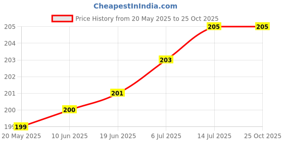 The current price is ₹205, which is ₹6 (3.0%) higher than the best price of ₹199 last seen on 20 May 2025. Over the 157 day price history period, prices have ranged from ₹199 to ₹205, with an average of ₹202. The pricing has been quite stable with low volatility, with prices remaining relatively stable overall. In terms of recent activity, there have been 0 price changes this week, 0 this month, and 4 over the past year. If you need this product now, it's a reasonable time to buy as prices are stable, but you might want to monitor for potential better deals.