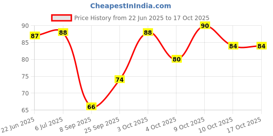 The current price is ₹84, which is ₹18 (27.3%) higher than the best price of ₹66 last seen on 8 Sep 2025. Over the 116 day price history period, prices have ranged from ₹66 to ₹90, with an average of ₹82. The pricing shows moderate volatility, with prices remaining relatively stable overall. In terms of recent activity, there have been 0 price changes this week, 4 this month, and 7 over the past year. If you need this product now, it's a reasonable time to buy as prices are stable, but you might want to monitor for potential better deals.
