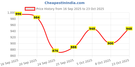 The current price is ₹948, which is ₹72 (8.2%) higher than the best price of ₹876 last seen on 24 Sep 2025. Over the 37 day price history period, prices have ranged from ₹876 to ₹996, with an average of ₹934. The pricing has been quite stable with low volatility, with prices remaining relatively stable overall. In terms of recent activity, there have been 0 price changes this week, 3 this month, and 6 over the past year. If you need this product now, it's a reasonable time to buy as prices are stable, but you might want to monitor for potential better deals.