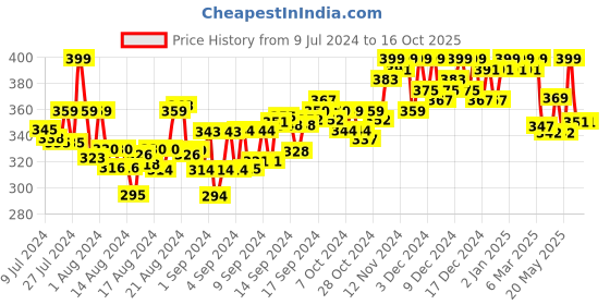 The current price is ₹351, which is ₹57 (19.4%) higher than the best price of ₹294 last seen on 1 Sep 2024. Over the 464 day price history period, prices have ranged from ₹294 to ₹399, with an average of ₹354. The pricing shows moderate volatility, with prices remaining relatively stable overall. In terms of recent activity, there have been 0 price changes this week, 0 this month, and 32 over the past year. If you need this product now, it's a reasonable time to buy as prices are stable, but you might want to monitor for potential better deals.