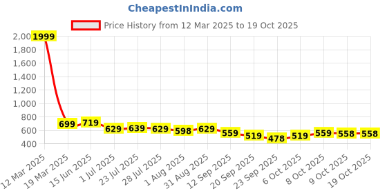 The current price is ₹558, which is ₹80 (16.7%) higher than the best price of ₹478 last seen on 23 Sep 2025. Over the 220 day price history period, prices have ranged from ₹478 to ₹1,999, with an average of ₹686. The pricing shows high volatility with significant fluctuations, and the overall trend is favorable for consumers as prices are getting cheaper. In terms of recent activity, there have been 0 price changes this week, 4 this month, and 13 over the past year. If you need this product now, it's a reasonable time to buy as prices are stable, but you might want to monitor for potential better deals.