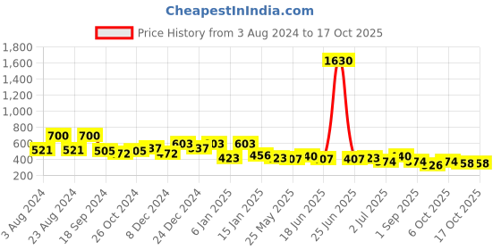The current price is ₹358, which is ₹32 (9.8%) higher than the best price of ₹326 last seen on 29 Sep 2025. Over the 439 day price history period, prices have ranged from ₹326 to ₹1,630, with an average of ₹514. The pricing shows high volatility with significant fluctuations, and the overall trend is favorable for consumers as prices are getting cheaper. In terms of recent activity, there have been 0 price changes this week, 2 this month, and 21 over the past year. If you need this product now, it's a reasonable time to buy as prices are stable, but you might want to monitor for potential better deals.