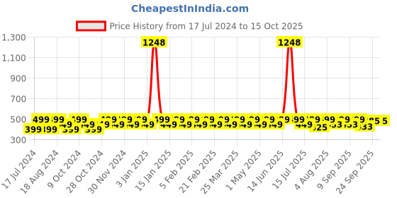 The current price is ₹485, which is ₹86 (21.6%) higher than the best price of ₹399 last seen on 17 Jul 2024. Over the 455 day price history period, prices have ranged from ₹399 to ₹1,248, with an average of ₹501. The pricing shows high volatility with significant fluctuations, but the overall trend is concerning as prices are getting more expensive. In terms of recent activity, there have been 0 price changes this week, 1 this month, and 38 over the past year. If you need this product now, it's a reasonable time to buy as prices are stable, but you might want to monitor for potential better deals.
