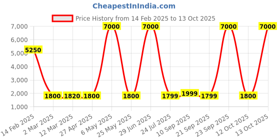 The current price is ₹7,000, which is ₹5,201 (289.1%) higher than the best price of ₹1,799 last seen on 24 Jul 2025. Over the 241 day price history period, prices have ranged from ₹1,799 to ₹7,000, with an average of ₹3,682. The pricing shows high volatility with significant fluctuations, but the overall trend is concerning as prices are getting more expensive. In terms of recent activity, there has been 1 price change this week, 3 this month, and 12 over the past year. If you need this product now, it's a reasonable time to buy as prices are stable, but you might want to monitor for potential better deals.