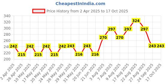 The current price is ₹243, which is ₹28 (13.0%) higher than the best price of ₹215 last seen on 26 Apr 2025. Over the 197 day price history period, prices have ranged from ₹215 to ₹324, with an average of ₹251. The pricing shows moderate volatility, with prices remaining relatively stable overall. In terms of recent activity, there have been 0 price changes this week, 0 this month, and 17 over the past year. If you need this product now, it's a reasonable time to buy as prices are stable, but you might want to monitor for potential better deals.