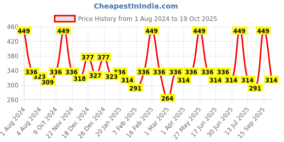 The current price is ₹314, which is ₹50 (18.9%) higher than the best price of ₹264 last seen on 1 Mar 2025. Over the 444 day price history period, prices have ranged from ₹264 to ₹449, with an average of ₹348. The pricing shows high volatility with significant fluctuations, and the overall trend is favorable for consumers as prices are getting cheaper. In terms of recent activity, there have been 0 price changes this week, 0 this month, and 26 over the past year. If you need this product now, it's a reasonable time to buy as prices are stable, but you might want to monitor for potential better deals.