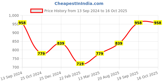 The current price is ₹958, which is ₹239 (33.2%) higher than the best price of ₹719 last seen on 22 Feb 2025. Over the 397 day price history period, prices have ranged from ₹719 to ₹958, with an average of ₹854. The pricing shows moderate volatility, with prices remaining relatively stable overall. In terms of recent activity, there have been 0 price changes this week, 0 this month, and 5 over the past year. The price direction is uncertain, so monitor the situation for a few more days before making a decision.
