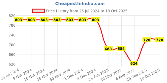 The current price is ₹720, which is ₹96 (15.4%) higher than the best price of ₹624 last seen on 6 Aug 2025. Over the 450 day price history period, prices have ranged from ₹624 to ₹803.33, with an average of ₹754. The pricing shows moderate volatility, and the overall trend is favorable for consumers as prices are getting cheaper. In terms of recent activity, there have been 0 price changes this week, 0 this month, and 9 over the past year. If you need this product now, it's a reasonable time to buy as prices are stable, but you might want to monitor for potential better deals.