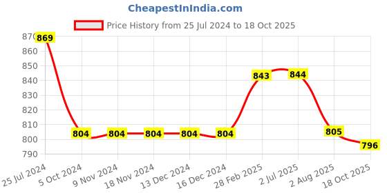 Good news! The current price of ₹796 is at its best ever level. Over the 450 day price history period, prices have ranged from ₹796 to ₹869.66, with an average of ₹818. The pricing has been quite stable with low volatility, and the overall trend is favorable for consumers as prices are getting cheaper. In terms of recent activity, there have been 0 price changes this week, 0 this month, and 7 over the past year. If you need this product now, it's a reasonable time to buy as prices are stable, but you might want to monitor for potential better deals.