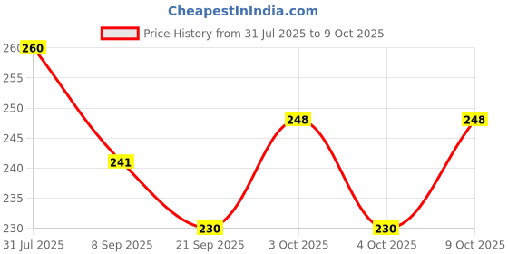 The current price is ₹248, which is ₹18 (7.8%) higher than the best price of ₹230 last seen on 21 Sep 2025. Over the 70 day price history period, prices have ranged from ₹230 to ₹260, with an average of ₹243. The pricing has been quite stable with low volatility, with prices remaining relatively stable overall. In terms of recent activity, there have been 0 price changes this week, 3 this month, and 5 over the past year. If you need this product now, it's a reasonable time to buy as prices are stable, but you might want to monitor for potential better deals.