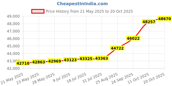 The current price is ₹48,670, which is ₹5,960 (14.0%) higher than the best price of ₹42,710 last seen on 21 May 2025. Over the 152 day price history period, prices have ranged from ₹42,710 to ₹48,670, with an average of ₹44,602. The pricing has been quite stable with low volatility, but the overall trend is concerning as prices are getting more expensive. In terms of recent activity, there have been 0 price changes this week, 2 this month, and 9 over the past year. Consider waiting before making a purchase as prices are rising and better deals may be available later.