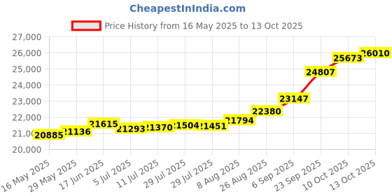 The current price is ₹26,010, which is ₹5,125 (24.5%) higher than the best price of ₹20,885 last seen on 16 May 2025. Over the 150 day price history period, prices have ranged from ₹20,885 to ₹26,010, with an average of ₹22,543. The pricing shows moderate volatility, but the overall trend is concerning as prices are getting more expensive. In terms of recent activity, there have been 0 price changes this week, 2 this month, and 12 over the past year. Consider waiting before making a purchase as prices are rising and better deals may be available later.