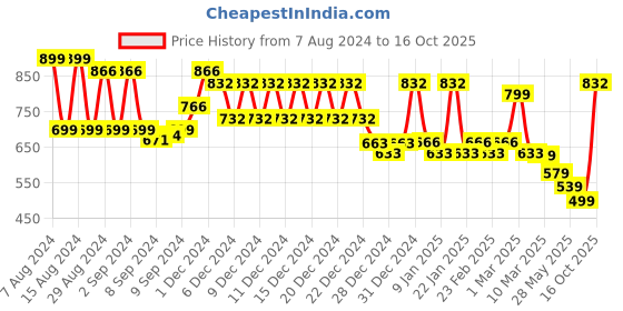 The current price is ₹832, which is ₹333 (66.7%) higher than the best price of ₹499 last seen on 30 May 2025. Over the 435 day price history period, prices have ranged from ₹499 to ₹899, with an average of ₹731. The pricing shows moderate volatility, and the overall trend is favorable for consumers as prices are getting cheaper. In terms of recent activity, there have been 0 price changes this week, 0 this month, and 31 over the past year. The price direction is uncertain, so monitor the situation for a few more days before making a decision.