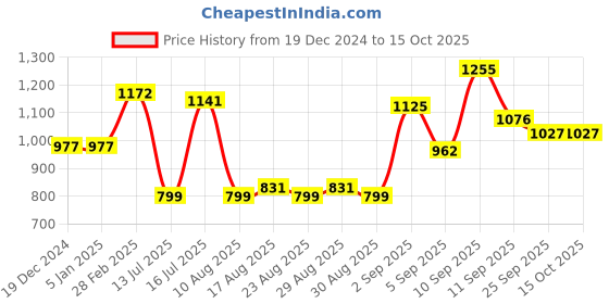 The current price is ₹1,027, which is ₹228 (28.5%) higher than the best price of ₹799 last seen on 13 Jul 2025. Over the 299 day price history period, prices have ranged from ₹799 to ₹1,255, with an average of ₹975. The pricing shows high volatility with significant fluctuations, but the overall trend is concerning as prices are getting more expensive. In terms of recent activity, there have been 0 price changes this week, 0 this month, and 14 over the past year. If you need this product now, it's a reasonable time to buy as prices are stable, but you might want to monitor for potential better deals.