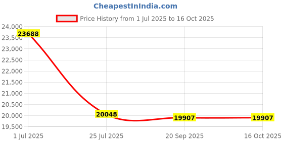 Fantastic! The current price of ₹19,907 is at its best ever level. Over the 107 day price history period, prices have ranged from ₹19,907 to ₹23,688, with an average of ₹20,888. The pricing shows moderate volatility, and the overall trend is favorable for consumers as prices are getting cheaper. In terms of recent activity, there have been 0 price changes this week, 0 this month, and 2 over the past year. This is an excellent time to make a purchase as prices are trending downward and conditions appear favorable.
