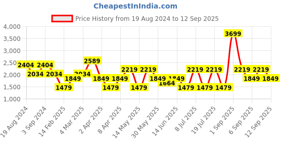 The current price is ₹1,849, which is ₹370 (25.0%) higher than the best price of ₹1,479 last seen on 14 Feb 2025. Over the 389 day price history period, prices have ranged from ₹1,479 to ₹3,699, with an average of ₹2,000. The pricing shows high volatility with significant fluctuations, and the overall trend is favorable for consumers as prices are getting cheaper. In terms of recent activity, there have been 0 price changes this week, 0 this month, and 23 over the past year. If you need this product now, it's a reasonable time to buy as prices are stable, but you might want to monitor for potential better deals.