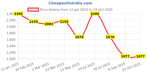 Exciting update! The current price of ₹1,077 is at its best ever level. Over the 285 day price history period, prices have ranged from ₹1,077 to ₹2,395, with an average of ₹1,854. The pricing shows high volatility with significant fluctuations, and the overall trend is favorable for consumers as prices are getting cheaper. In terms of recent activity, there have been 0 price changes this week, 0 this month, and 7 over the past year. This is an excellent time to make a purchase as prices are trending downward and conditions appear favorable.