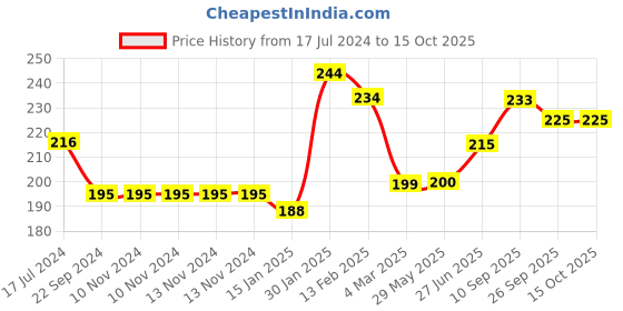 The current price is ₹225, which is ₹36.27 (19.2%) higher than the best price of ₹188.73 last seen on 15 Jan 2025. Over the 454 day price history period, prices have ranged from ₹188.73 to ₹244.51, with an average of ₹211. The pricing shows moderate volatility, with prices remaining relatively stable overall. In terms of recent activity, there have been 0 price changes this week, 0 this month, and 11 over the past year. If you need this product now, it's a reasonable time to buy as prices are stable, but you might want to monitor for potential better deals.