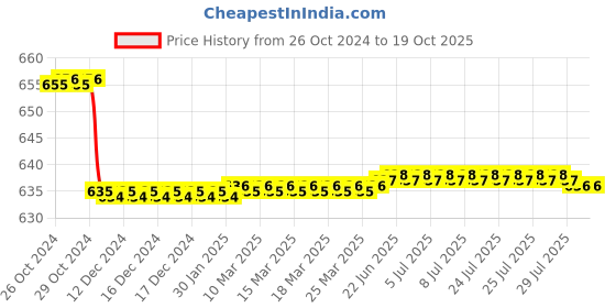 The current price is ₹636, which is ₹2 (0.3%) higher than the best price of ₹634 last seen on 27 Nov 2024. Over the 357 day price history period, prices have ranged from ₹634 to ₹656, with an average of ₹638. The pricing has been quite stable with low volatility, with prices remaining relatively stable overall. In terms of recent activity, there have been 0 price changes this week, 0 this month, and 46 over the past year. If you need this product now, it's a reasonable time to buy as prices are stable, but you might want to monitor for potential better deals.
