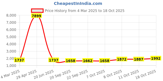 The current price is ₹1,992, which is ₹334 (20.1%) higher than the best price of ₹1,658 last seen on 20 Sep 2025. Over the 228 day price history period, prices have ranged from ₹1,658 to ₹7,899, with an average of ₹2,456. The pricing shows high volatility with significant fluctuations, but the overall trend is concerning as prices are getting more expensive. In terms of recent activity, there have been 0 price changes this week, 5 this month, and 8 over the past year. Consider waiting before making a purchase as prices are rising and better deals may be available later.
