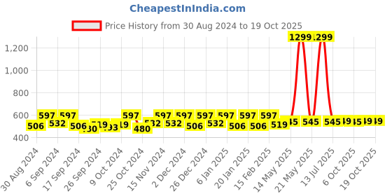 The current price is ₹549, which is ₹69 (14.4%) higher than the best price of ₹480 last seen on 25 Sep 2024. Over the 414 day price history period, prices have ranged from ₹480 to ₹1,299, with an average of ₹590. The pricing shows high volatility with significant fluctuations, but the overall trend is concerning as prices are getting more expensive. In terms of recent activity, there have been 0 price changes this week, 2 this month, and 21 over the past year. If you need this product now, it's a reasonable time to buy as prices are stable, but you might want to monitor for potential better deals.