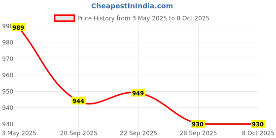Exciting update! The current price of ₹930 is at its best ever level. Over the 156 day price history period, prices have ranged from ₹930 to ₹989, with an average of ₹948. The pricing has been quite stable with low volatility, and the overall trend is favorable for consumers as prices are getting cheaper. In terms of recent activity, there have been 0 price changes this week, 2 this month, and 3 over the past year. If you need this product now, it's a reasonable time to buy as prices are stable, but you might want to monitor for potential better deals.