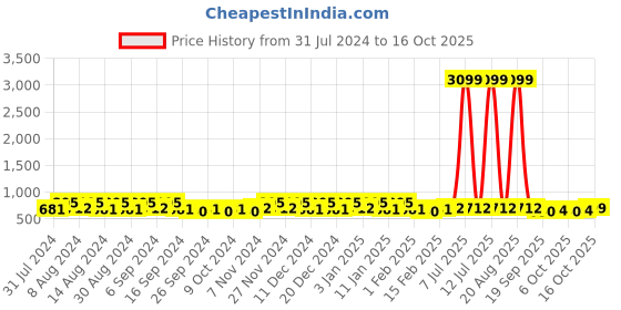 The current price is ₹699, which is ₹49 (7.5%) higher than the best price of ₹650 last seen on 25 Sep 2024. Over the 442 day price history period, prices have ranged from ₹650 to ₹3,099, with an average of ₹883. The pricing shows high volatility with significant fluctuations, with prices remaining relatively stable overall. In terms of recent activity, there have been 0 price changes this week, 4 this month, and 27 over the past year. If you need this product now, it's a reasonable time to buy as prices are stable, but you might want to monitor for potential better deals.