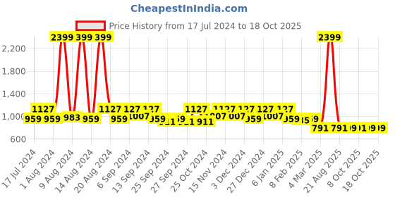 The current price is ₹799, which is ₹8 (1.0%) higher than the best price of ₹791 last seen on 4 Mar 2025. Over the 458 day price history period, prices have ranged from ₹791 to ₹2,399, with an average of ₹1,130. The pricing shows high volatility with significant fluctuations, and the overall trend is favorable for consumers as prices are getting cheaper. In terms of recent activity, there have been 0 price changes this week, 2 this month, and 17 over the past year. If you need this product now, it's a reasonable time to buy as prices are stable, but you might want to monitor for potential better deals.