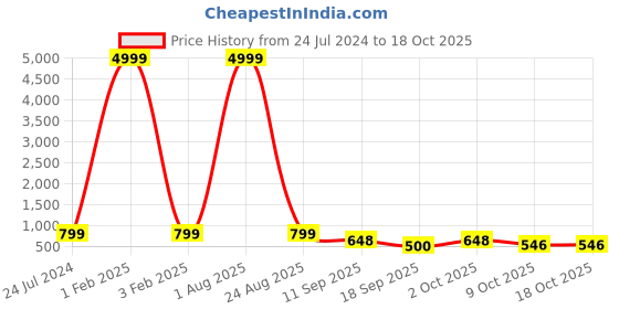 The current price is ₹546, which is ₹46 (9.2%) higher than the best price of ₹500 last seen on 18 Sep 2025. Over the 451 day price history period, prices have ranged from ₹500 to ₹4,999, with an average of ₹1,528. The pricing shows high volatility with significant fluctuations, and the overall trend is favorable for consumers as prices are getting cheaper. In terms of recent activity, there have been 0 price changes this week, 1 this month, and 7 over the past year. This is an excellent time to make a purchase as prices are trending downward and conditions appear favorable.