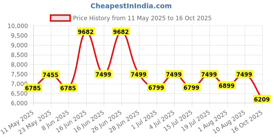 Awesome! The current price of ₹6,209 is at its best ever level. Over the 158 day price history period, prices have ranged from ₹6,209 to ₹9,682, with an average of ₹7,471. The pricing shows moderate volatility, and the overall trend is favorable for consumers as prices are getting cheaper. In terms of recent activity, there have been 0 price changes this week, 0 this month, and 13 over the past year. This is an excellent time to make a purchase as prices are trending downward and conditions appear favorable.