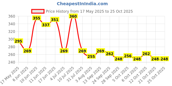 Great news for shoppers! The current price of ₹248 is at its best ever level. Over the 160 day price history period, prices have ranged from ₹248 to ₹360, with an average of ₹282. The pricing shows moderate volatility, and the overall trend is favorable for consumers as prices are getting cheaper. In terms of recent activity, there have been 0 price changes this week, 4 this month, and 15 over the past year. If you need this product now, it's a reasonable time to buy as prices are stable, but you might want to monitor for potential better deals.