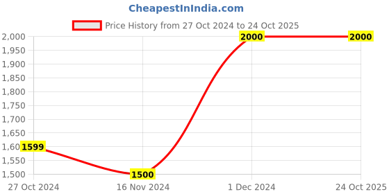 The current price is ₹2,000, which is ₹500 (33.3%) higher than the best price of ₹1,500 last seen on 16 Nov 2024. Over the 362 day price history period, prices have ranged from ₹1,500 to ₹2,000, with an average of ₹1,775. The pricing shows moderate volatility, but the overall trend is concerning as prices are getting more expensive. In terms of recent activity, there have been 0 price changes this week, 0 this month, and 2 over the past year. Consider waiting before making a purchase as prices are rising and better deals may be available later.