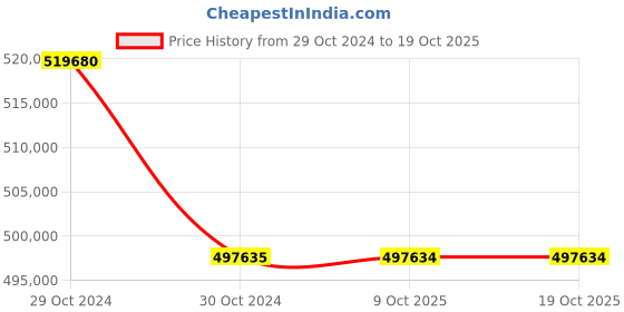 Exciting update! The current price of ₹497,634 is at its best ever level. Over the 354 day price history period, prices have ranged from ₹497,634 to ₹519,680, with an average of ₹503,146. The pricing has been quite stable with low volatility, with prices remaining relatively stable overall. In terms of recent activity, there have been 0 price changes this week, 0 this month, and 2 over the past year. If you need this product now, it's a reasonable time to buy as prices are stable, but you might want to monitor for potential better deals.