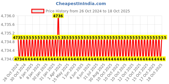 The current price is ₹4,735, which is ₹1 (0.0%) higher than the best price of ₹4,734 last seen on 27 Oct 2024. Over the 356 day price history period, prices have ranged from ₹4,734 to ₹4,736, with an average of ₹4,735. The pricing has been quite stable with low volatility, with prices remaining relatively stable overall. In terms of recent activity, there have been 19 price changes this week, 37 this month, and 98 over the past year. If you need this product now, it's a reasonable time to buy as prices are stable, but you might want to monitor for potential better deals.