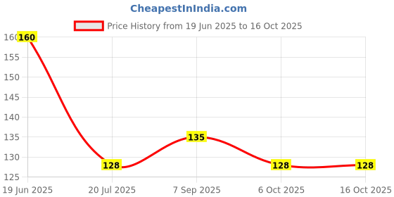 Great news for shoppers! The current price of ₹128 is at its best ever level. Over the 119 day price history period, prices have ranged from ₹128 to ₹160, with an average of ₹136. The pricing shows moderate volatility, and the overall trend is favorable for consumers as prices are getting cheaper. In terms of recent activity, there have been 0 price changes this week, 0 this month, and 3 over the past year. If you need this product now, it's a reasonable time to buy as prices are stable, but you might want to monitor for potential better deals.
