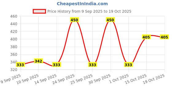 The current price is ₹405, which is ₹72 (21.6%) higher than the best price of ₹333 last seen on 9 Sep 2025. Over the 39 day price history period, prices have ranged from ₹333 to ₹450, with an average of ₹376. The pricing shows moderate volatility, but the overall trend is concerning as prices are getting more expensive. In terms of recent activity, there have been 0 price changes this week, 4 this month, and 7 over the past year. If you need this product now, it's a reasonable time to buy as prices are stable, but you might want to monitor for potential better deals.