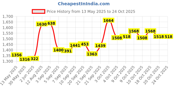 The current price is ₹1,518, which is ₹202 (15.3%) higher than the best price of ₹1,316 last seen on 30 May 2025. Over the 164 day price history period, prices have ranged from ₹1,316 to ₹1,664, with an average of ₹1,480. The pricing shows moderate volatility, but the overall trend is concerning as prices are getting more expensive. In terms of recent activity, there has been 1 price change this week, 6 this month, and 17 over the past year. If you need this product now, it's a reasonable time to buy as prices are stable, but you might want to monitor for potential better deals.