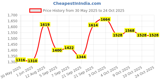 The current price is ₹1,528, which is ₹218 (16.6%) higher than the best price of ₹1,310 last seen on 1 Jun 2025. Over the 147 day price history period, prices have ranged from ₹1,310 to ₹1,664, with an average of ₹1,487. The pricing shows moderate volatility, but the overall trend is concerning as prices are getting more expensive. In terms of recent activity, there have been 0 price changes this week, 3 this month, and 10 over the past year. If you need this product now, it's a reasonable time to buy as prices are stable, but you might want to monitor for potential better deals.