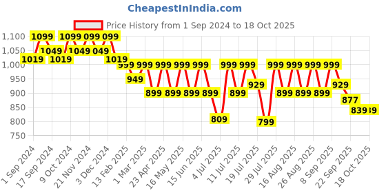 The current price is ₹839, which is ₹40 (5.0%) higher than the best price of ₹799 last seen on 23 Jul 2025. Over the 412 day price history period, prices have ranged from ₹799 to ₹1,099, with an average of ₹966. The pricing shows moderate volatility, and the overall trend is favorable for consumers as prices are getting cheaper. In terms of recent activity, there have been 0 price changes this week, 2 this month, and 30 over the past year. If you need this product now, it's a reasonable time to buy as prices are stable, but you might want to monitor for potential better deals.