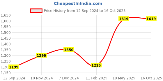 The current price is ₹1,619, which is ₹420 (35.0%) higher than the best price of ₹1,199 last seen on 12 Sep 2024. Over the 399 day price history period, prices have ranged from ₹1,199 to ₹1,619, with an average of ₹1,384. The pricing shows moderate volatility, but the overall trend is concerning as prices are getting more expensive. In terms of recent activity, there have been 0 price changes this week, 0 this month, and 3 over the past year. Consider waiting before making a purchase as prices are rising and better deals may be available later.